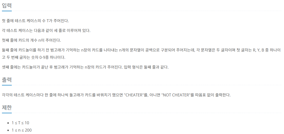 System.out.println(Arrays.equals(before, after) ? "NOT CHEATER" : "CHEATER");