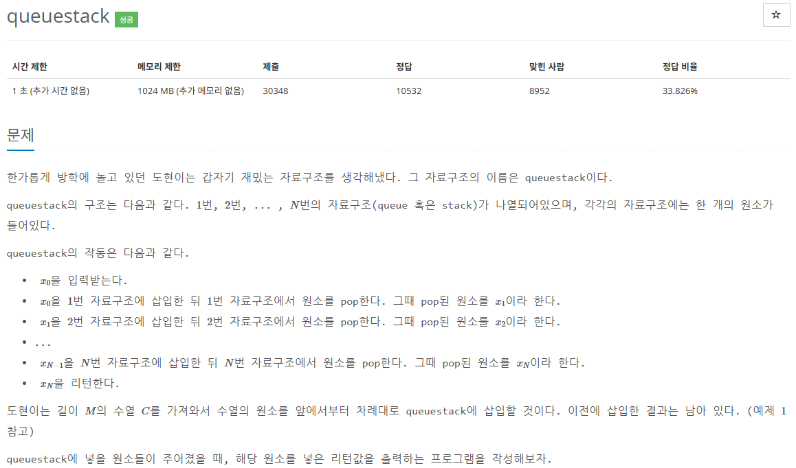 예시로 1번 예제와 같이 보면 [0, 1, 1, 0]인 경우 [큐, 스택, 스택, 큐] 이렇게 되어 다음 입력 배열인 [1(큐), 2(스택), 3(스택), 4(큐)] 형식으로 정해지게 됩니다.