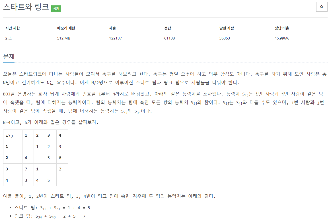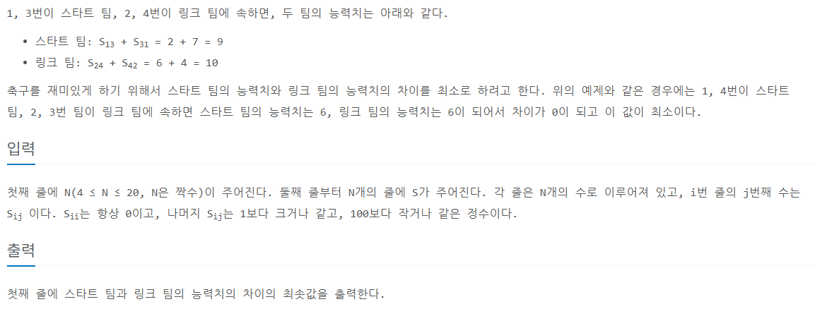 n과 m문제를 푼 것이 생각나서 해당 방식으로 필요 인원수만큼 백트래킹을 진행하고 인원수만큼 고른 이후에 visited를 기준으로 팀을 나누고 팀에 따른 능력치 차이와 최소 능력치 차이를 비교하여 해결했습니다. 다만 팀을 구하는 과정에서 index를 각가 두고 해야 하는데 막 작성하다 해당 부분을 간과해서 index 오류로 한번 틀렸었습니다.