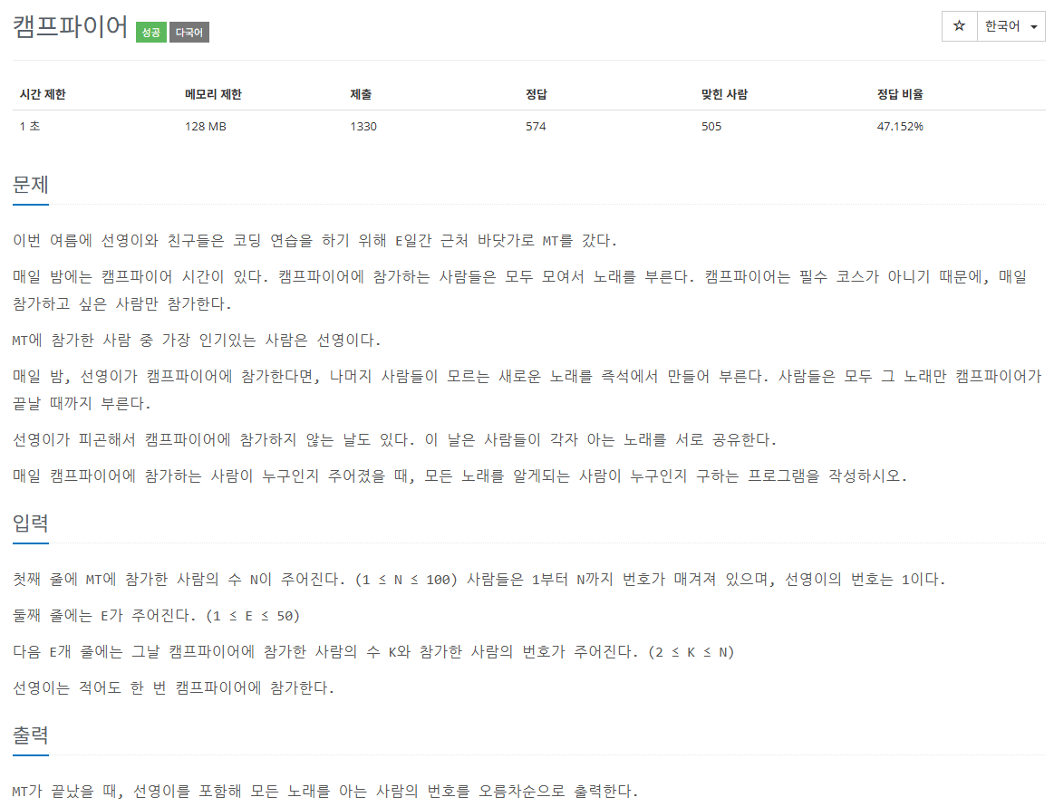 문제를 이해하는 것에 조금 걸렸습니다. 선영이가 참여하면 새로운 노래가 생기고 해당 노래를 저장 및 참여 인원 노래 리스트에 추가합니다. 만약 선영이 참여 안 하면 참여 인원들끼리 노래를 교환해 동기화합니다. 이 2개를 이해하고 나서는 해결할 수 있었습니다.