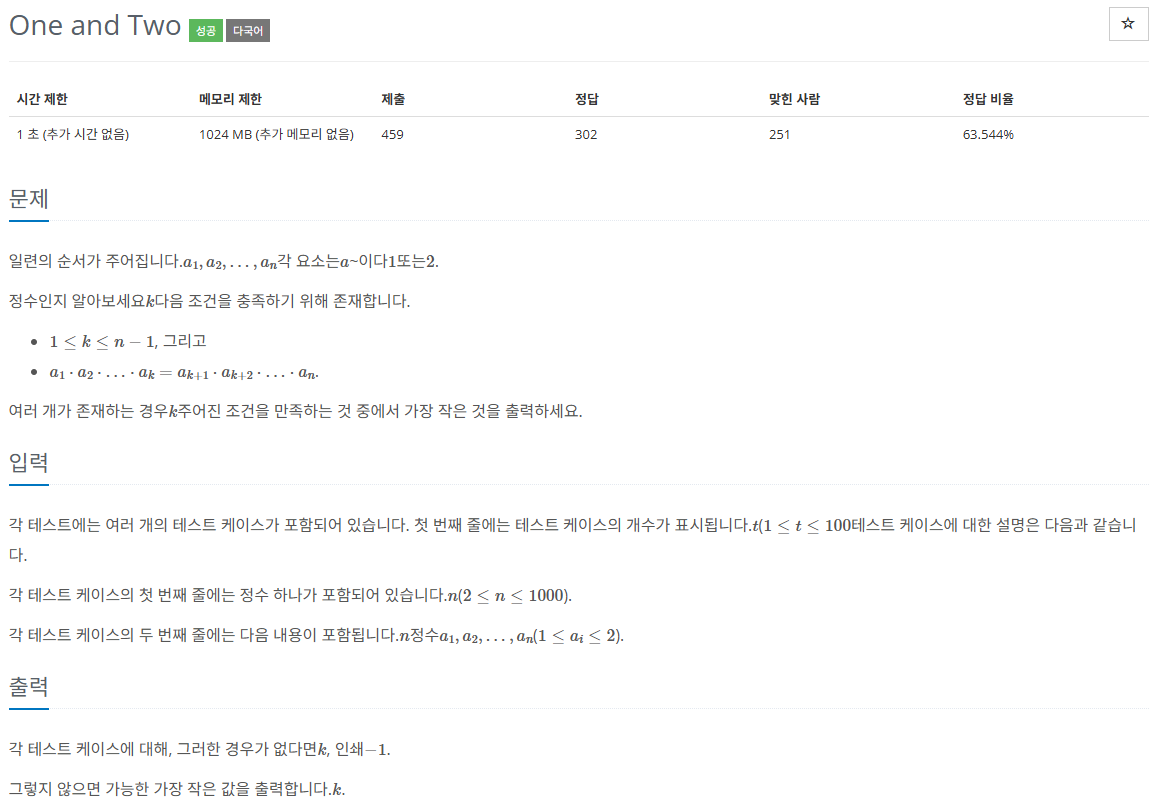 처음에는 1, 2가 아니라 범위가 더 넓은 값인 줄 알고 누적곱을 활용해 풀었습니다. 하지만 입력이 1, 2만 주어지고 배열의 크기가 1000까지 기 때문에 값이 끝까지 가면 2^1000까지 가서 범위를 벗어나게 되어 틀렸습니다. 1, 2가 주어진 것과 2의 개수를 계산해서 풀어라 라는 힌트를 받고 총개수를 2로 나눈 값과 같으면 왼쪽과 오른쪽의 각 누적 곱이 같아지기 때문에 그 로직을 사용해 해결했습니다.