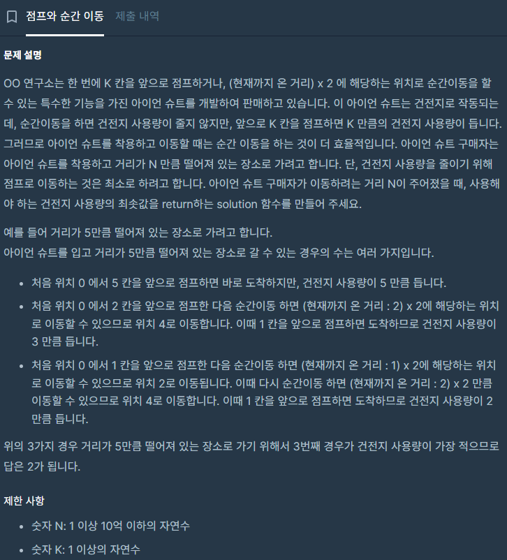 처음에는 재귀를 통해서 해결하려나 시간 초과도 나고 로직 자체가 복잡해져서 못풀었습니다. 그래서 좀 찾아보니 2배로 이동하는게 에너지가 사용이 안되니 2의 배수가 아닌경우 1을 빼주면 이전 단계에서 1을 이동해서 배수를 맞춘것 이므로 최소한으로 에너지를 쓰면서 이동 할 수 있는 것을 알게 되어 해결했습니다.