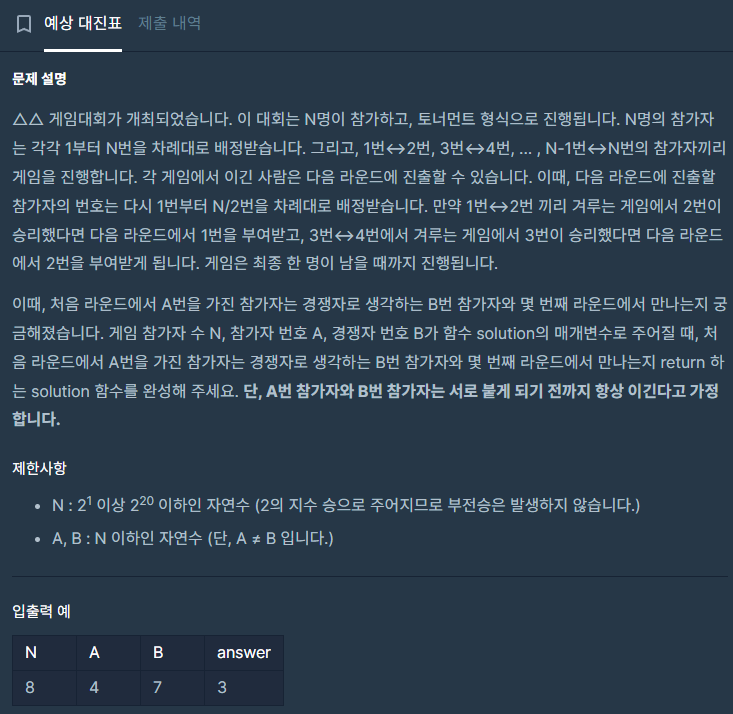 다른 사람의 풀이를 보니 제거 처럼 위에서 나누면서 가는게 아니라 아래서 올라오는 방법이 있었습니다. 라운드 번호를 맞추기 위해 증감이 필요한데 +로 할경우 상위 경기로 갈때 홀수 기준으로 계산을 해서 계속 더해줘야 합니다. 하지만 -로 맞춰주게 되면 홀수를 짝수로 변경해서 짝수 기준으로 진행하므로 좀더 보기 편해서 해당 방법으로 다시 풀어봤습니다.