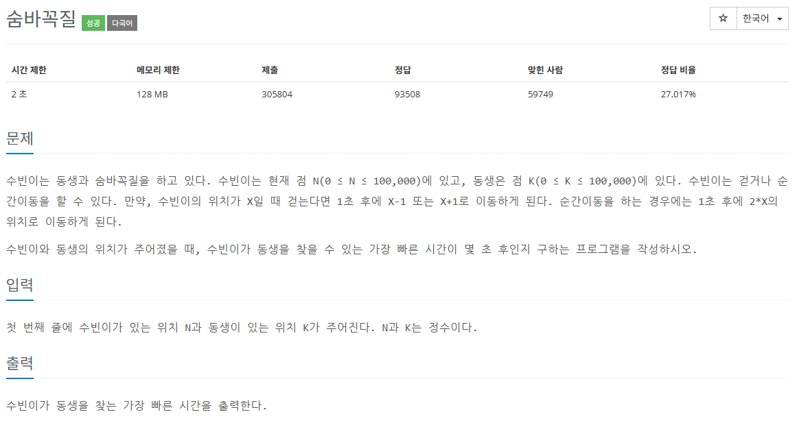 이전에 풀었던 bfs, dfs 문제들과 비슷하게 생각해 visited를 안 만들고 하다가 접근을 잘못했습니다. visited를 적용하고 따로 움직인 시간을 저장할 배열이 하나 더 필요해서 해당 부분도 따로 선언해 이전 값에 + 1 한 값을 저장하도록 하여 해결했습니다.