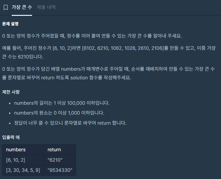 처음 정렬을 숫자를 문자열로 바꾸어 길이가 길면 뒤로 같으면 내림차순으로 정렬을 하였습니다. 하지만 그렇게 하면 2개의 문자열의 합이 큰 순서로 보장할 수없어서 문자열 2개의 합의 내림차순으로 정렬을 해야 했습니다. 또한 0이 처음안나 오면 10000과 같이 상관이 없지만 처음 나온 경우 000과 같은 경우가 생기기 때문에 그 부분은 모드 0 하나로 반환해야 하는 부분도 체크해야 했습니다.