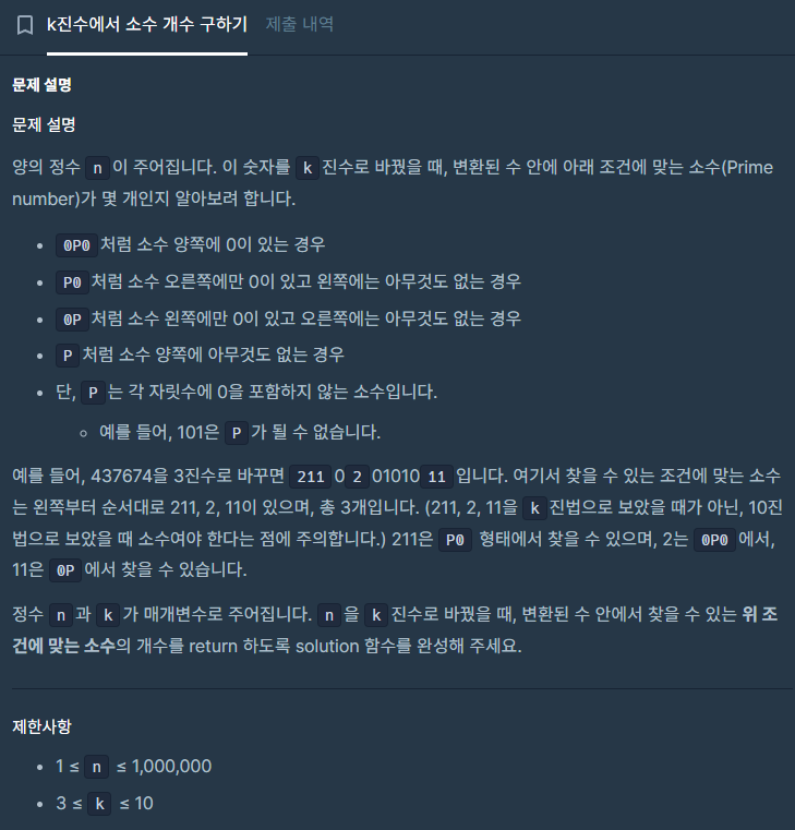 로직을 다 짜고나서 진법 변환 후 값이 문제가 좀 있었습니다. Integer.parseInt를 통해 소수 계산을 했지만 틀려서 찾아보니 진법 변환후 0을 기준으로 나눈 수가 21억이 넘는 경우가 있었고 이를 해결하기 위해 long으로 바꾸어서 해결했습니다.