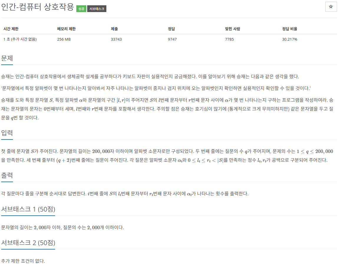 처음 만들 때 알파벳 개수를 +1 안 해서 값을 넣는데 문제가 생겼었고 그 이후 범위 내의 개수 합을 구할 때, right가 포함되어야 하는데 안 되는 줄 알고 풀어 틀렸었습니다. 이 부분들을 고쳐서 값은 다 나와서 넣었으나 출력이 많아서 50점이 나와서 StringBuilder를 다시 적용하니 해결되었습니다.