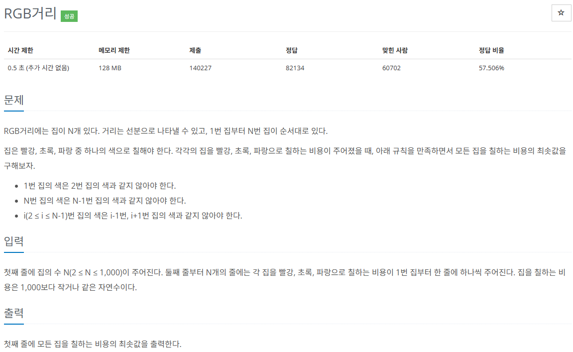 처음에는 상태 관리를 따로 해서 각각 구해야 하는지 모르고 기존 1차원 배열을 만들어 풀려하니 풀리지 않았습니다. 그래서 찾아보니 상태를 각각 관리하여야 했고 이후에는 dp를 기준으로 rgbVals에서 고를 수 있는 최솟값을 가지고 저장했는데 이것도 rgbVals를 기준으로 이전 dp의 최솟값을 더해서 저장을 하는 게 맞았습니다. 이 부분을 해결하니 통과하였습니다.