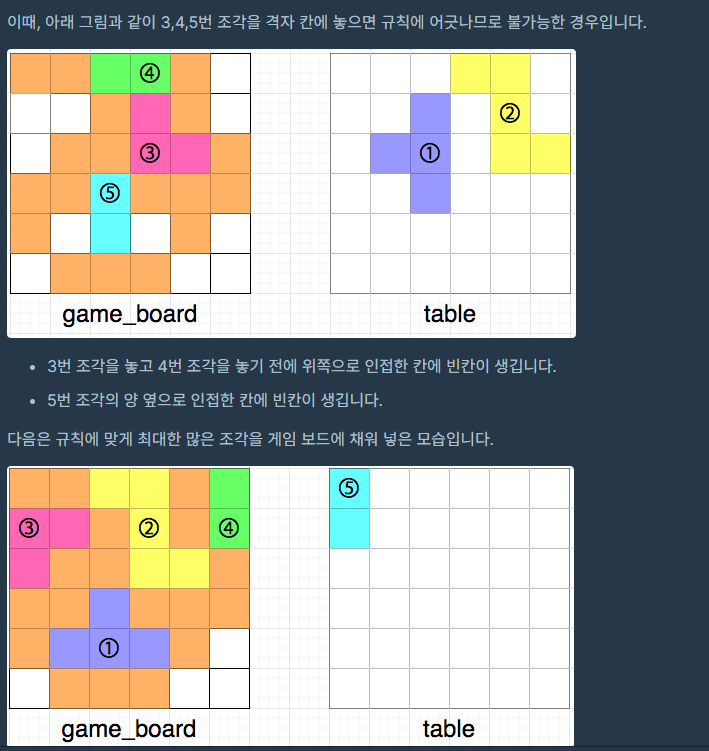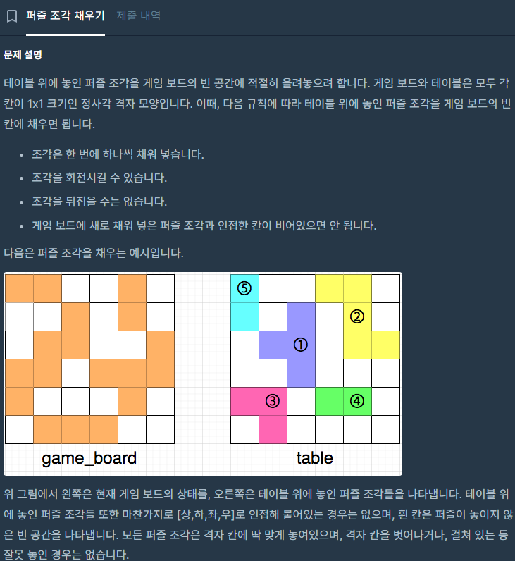 이 3가지를 힌트를 처음에는 이게 구현이 될까 했지만 하나하나 구현을 해보니 되기는 했습니다. 하지만 구멍과 도형 비교에 list.equals를 사용했는데 이상하게 나와 찾아보니 저는 객체를 사용해서 했기 때문에 isSame이란 메서드를 다시 만들어 해결했습니다. 그리고 문제가 길다 보니 도형이 들어갈 때마다 1개씩 증가인 줄 알았지만 도형의 크기만큼 증가라 이 부분도 수정해서 해결했습니다.