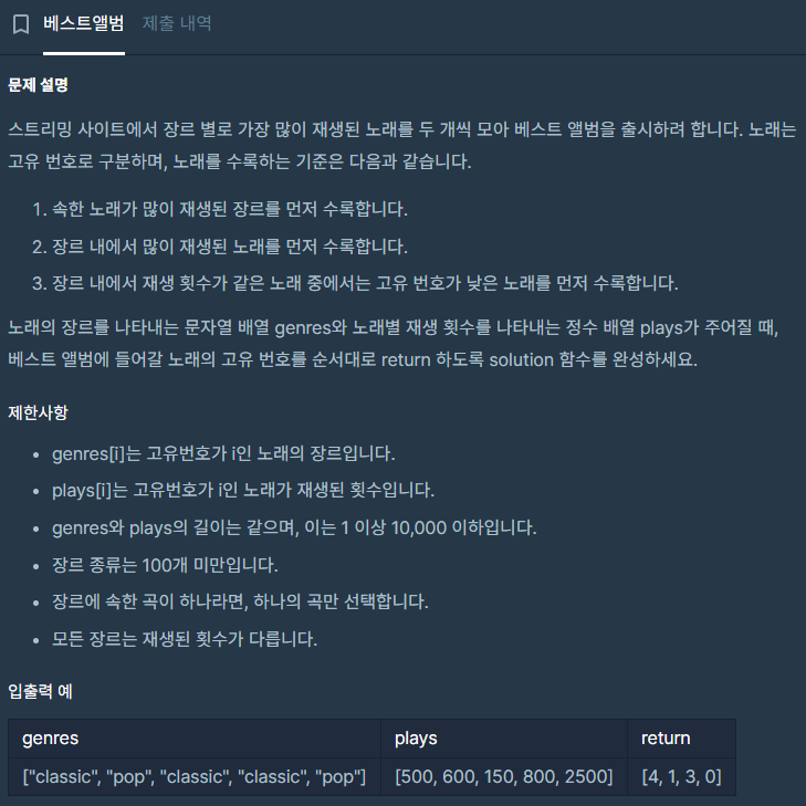 처음에 1개의 map에 다 담으려고 생각하다가 로직 구상이 꼬여서 못 짰었습니다. 2개의 map을 이용해 보라는 힌트를 얻고 그를 통해서 로직을 짜서 어느 정도 완성을 시켰지만 songs를 정렬시킬 때 index도 같이 정렬을 안 시키거나 해당 장르의 노래 정보 개수가 2보다 작은 경우를 고려 안 해서 몇 번 틀렸습니다.