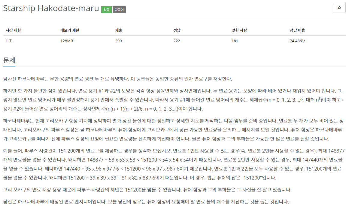 문제를 번역해 보니 3 제곱 값과 n * (n + 1) * (n + 2) / 6의 값을 더한 값 중 주어진 값 안에서 가장 큰 값을 구하면 되는 문제였습니다. 그래서 로직을 짜고 했으나 if문의 사소한 실수로 한번 틀렸고 이를 수정하여 해결했습니다.