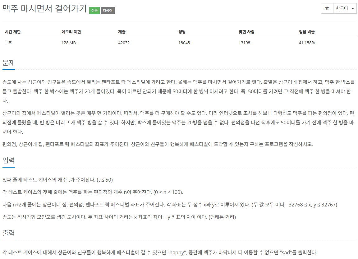 위의 2개의 힌트를 보고 class를 만들어서 row, col을 저장하고 이동 가능한 위치를 담아 모든 위치를 탐색하여 페스티벌 위치에 도착하게 되면 happy 아니면 sad를 반환하도록 하여 해결했습니다.
