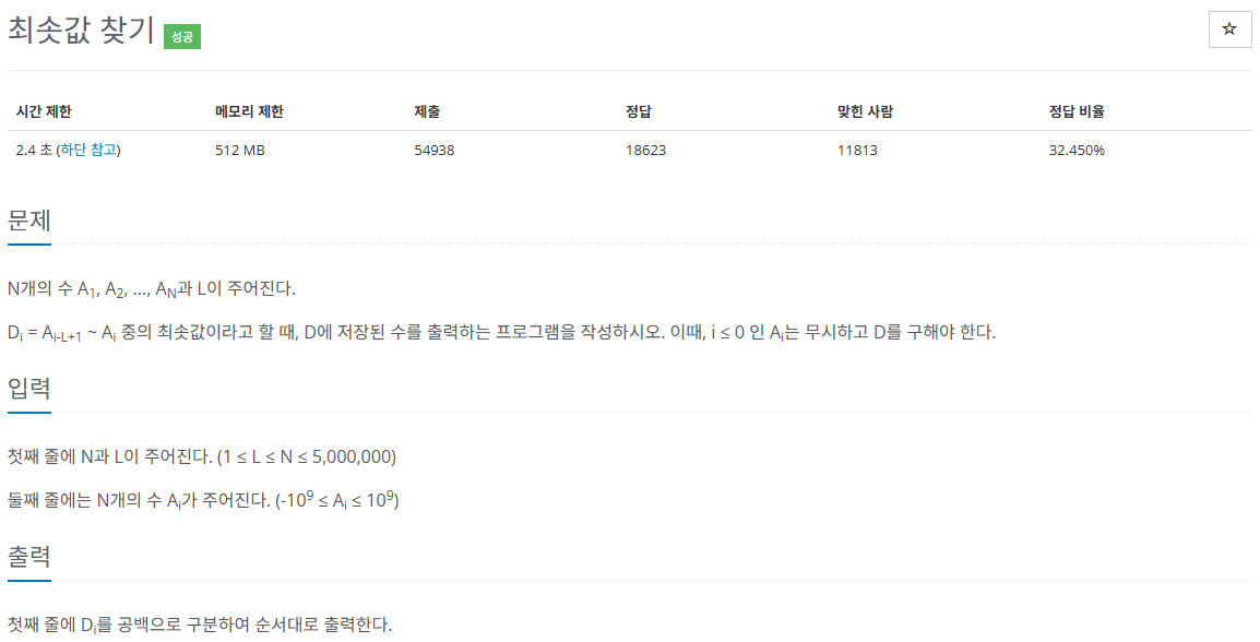 그냥 구현으로 풀었으나 시간 초과 문제가 생겨서 뭐가 문제인지 찾아보았습니다. 찾아보니 단조 큐라는 덱을 이용해서 필요값만 저 정하여 값을 계산하는 방식을 사용해야 했습니다. 처음 접했을 때 아 이런 방법이 있구나 확인을 하고 제가 스스로 짤 수 있을 때 제출하여 해결했습니다.