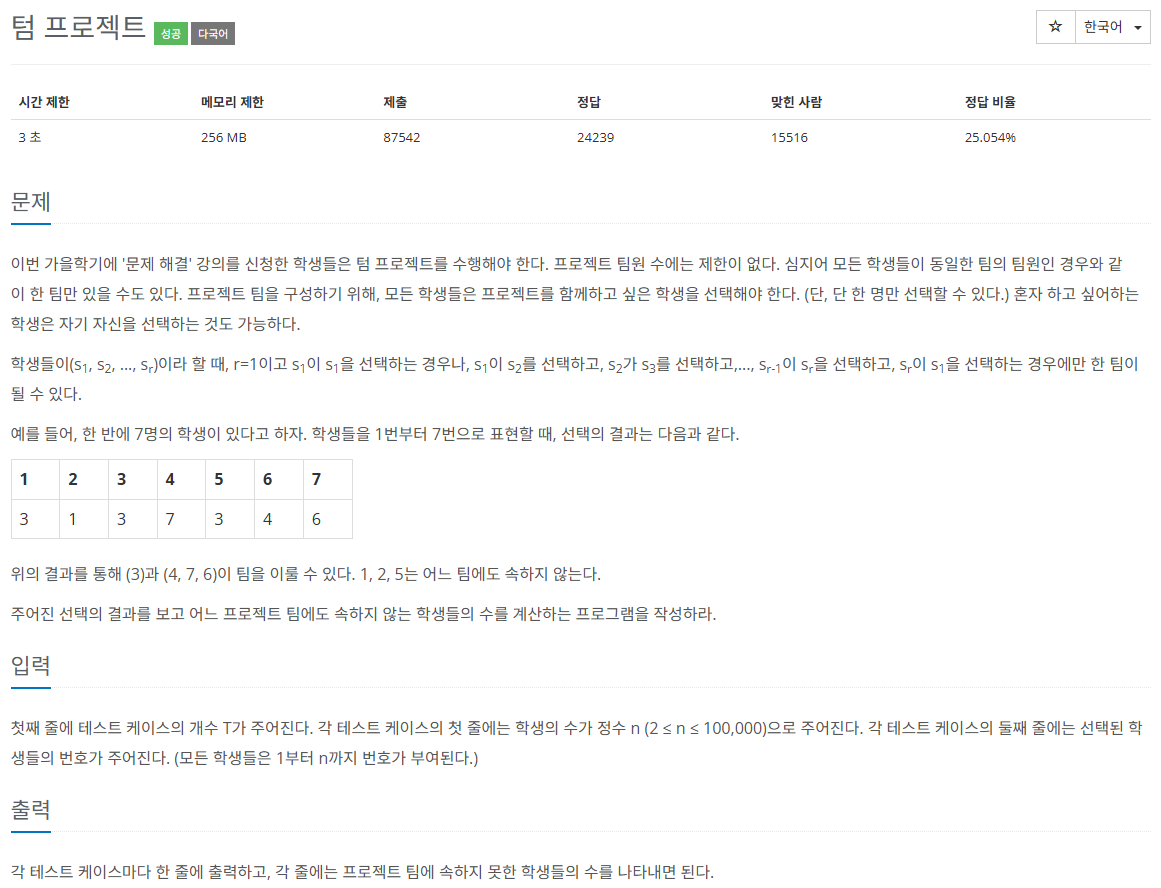 뭔가 DFS의 응용인데 finished라는 또 다른 확인 배열과 다음 학생 노드를 계속 돌면서 새야 하는 방법을 써서 다른 방식의 응용이라 많이 틀렸습니다.
