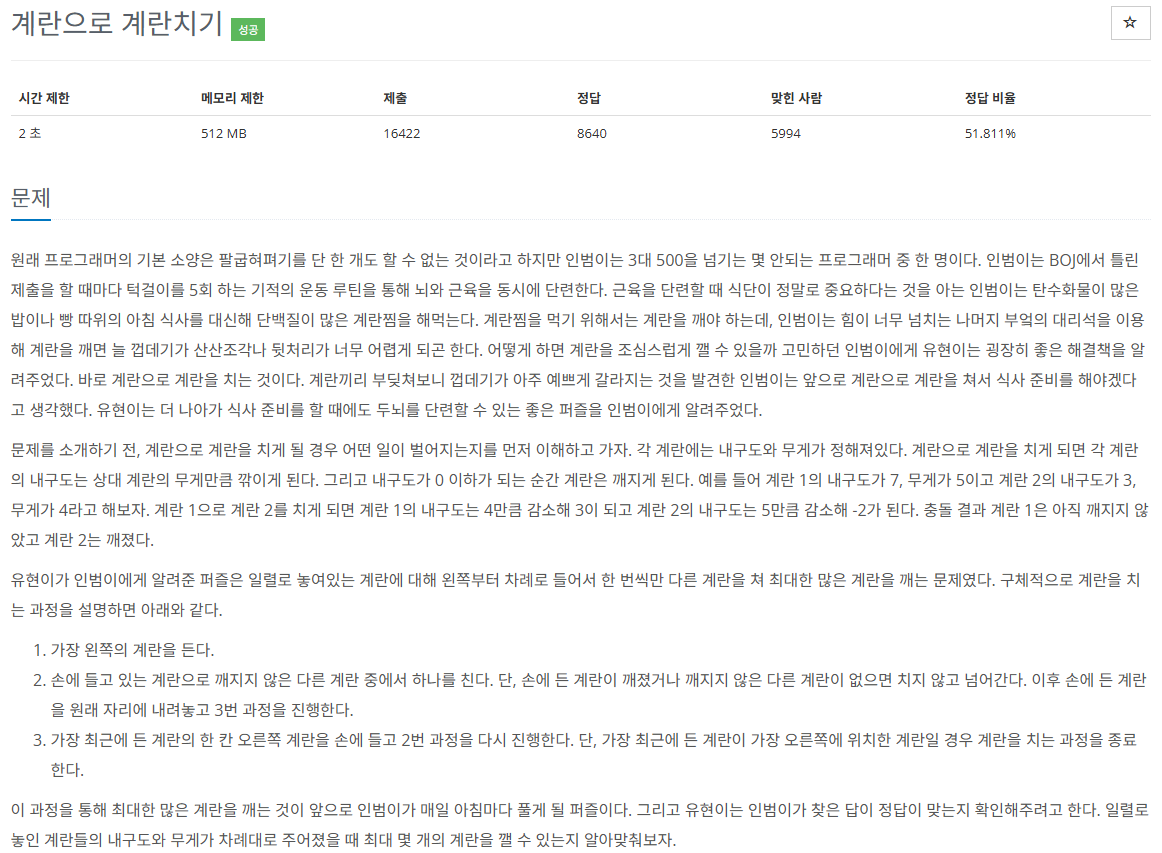 그래서 문제의 설명을 잘못 이해한 부분을 다시 다른 설명 등을 보고 바로 잡고 부분은 저장된 eggs의 hp를 통해 구해서 계산하는 방법을 사용해 보라는 힌트를 보고 해결했습니다. 하지만 이후 2가지 추가적인 문제가 생겼는데 현재 계란이 깨진 경우 다음으로 안 넘긴 것과 부딪힐 계란이 없는 경우 바로 계산 로직에 보내야 하는 것을 빼먹어서 문제가 생겼고 이 것들을 인지한 뒤 다시 풀어 해결했습니다.