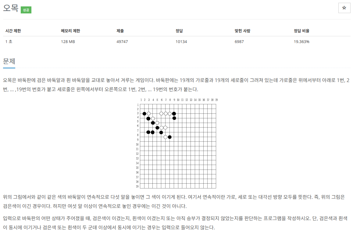 하지만 추가적인 문제가 생겼는데 6목 문제와 좌햐향 방향의 경우의 문제도 있었습니다. 6목과 같은 경우 같은 방향으로 이전 위치에 같은 색상이 있는 경우 넘어가도록 하여 해결할 수 있었고, 좌하향 같은 경우는 while문 탈출시 마지막 같은 색인 경우 위치정보로 세팅하고 오목인 경우 해당 값을 반환하도록 하여 해결했습니다.