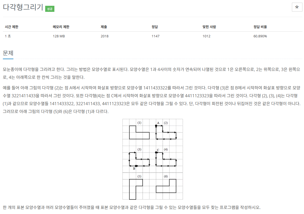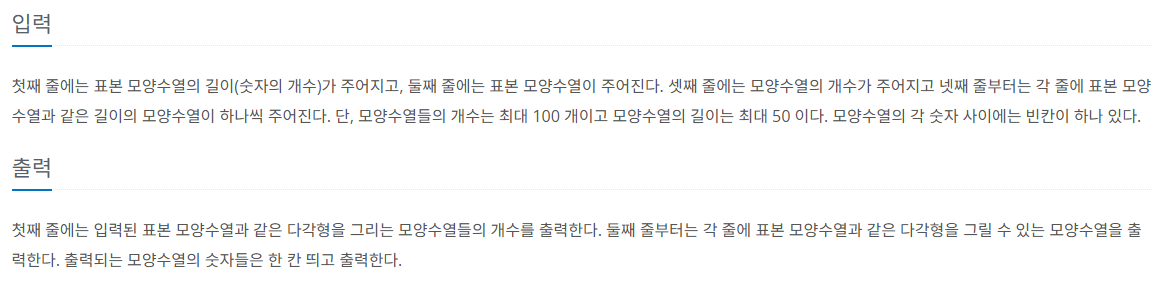 처음에 정렬한 2개의 샘플이 같은 경우 같은 모양이 나오는 것으로 생각을 해서 그렇게 했으나 틀렸습니다. 그래서 잘 못 이해한 건지 찾아보니 시작점에 따른 정방향 이동해여 만들어지는 모양과 역방향으로 이동하여 만들어지는 모양을 계산해야 했습니다.