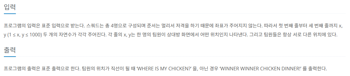 System.out.println(slope1 == slope2 ? "WHERE IS MY CHICKEN?" : "WINNER WINNER CHICKEN DINNER!");