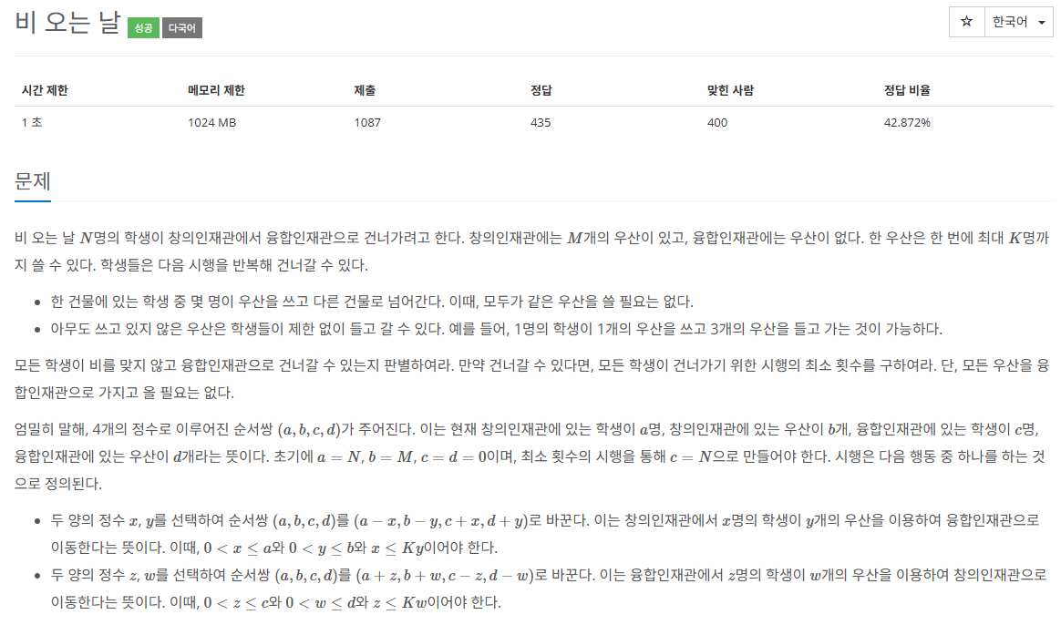 우산을 가져오는 것과 가져오는 횟수도 포함을 해서 로직을 짜야하는데 문제 이해를 잘못했었지만, 이를 알고 다시 로직을 수정해 해결했습니다
