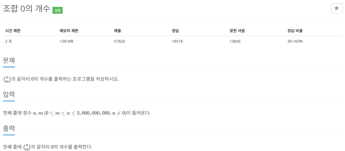 처음에 끝에 0의 갯수라서 조합의 갯수를 구하고 10으로 나눌수 없을 때까지 계산하려 했으나 잘못된 접근이었습니다.