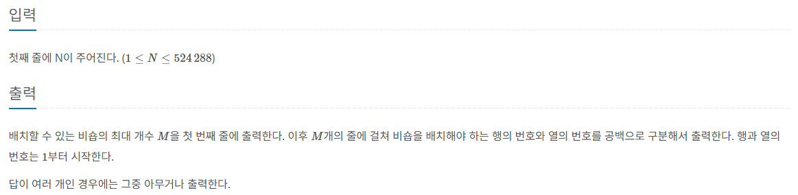 그래서 힌트를 찾아보니 첫번째 줄을 비숍으로 채우고 나머지 비숍 넣을 수 있는 곳을 찾으라는 것을 보고 n + n - 2라는 공식이 size가 1보다 클 경우 적용이 되었습니다. 또한, 넣는 비숍의 위치가 마지막 줄의 양끝을 빼고 들어갈 수 있으므로 이를 이용해 해결했습니다.