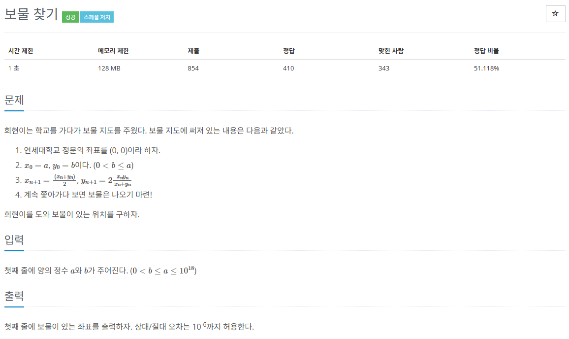 즉, 어떤 두 수 a, b가 주어졌을 때, 이 두 수의 산술평균과 기하평균이 같아지는 지점이 바로 보물이 있는 곳으로 이 식에서 등호가 성립할 조건은 바로 a = b일 때입니다. 따라서, 이 문제는 a와 b가 계속 변하면서 최종적으로 a와 b가 같아지는 지점의 값을 출력하라는 의미이기 때문에 2개의 곱의 루트가 각각 같은 수여서 이를 힌트로 해결했습니다.