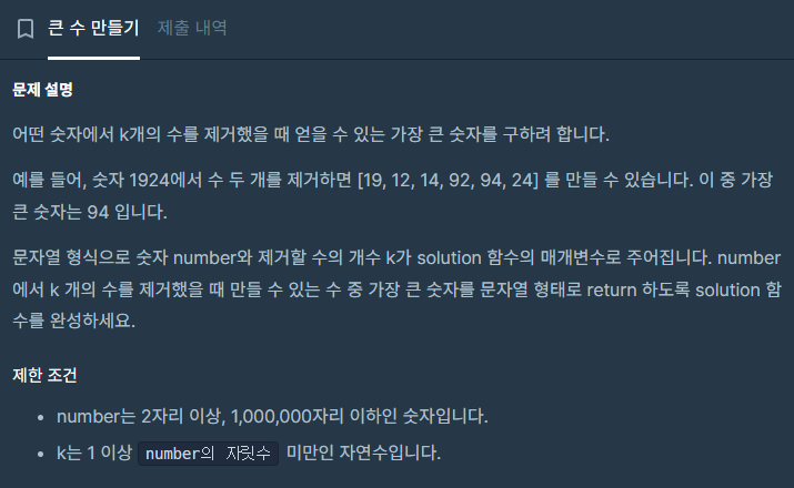 처음에 deq에서 제거, 추가 로직은 잘짰으나 틀려서 문제 찾아보니 같거나 큰수가 계속 들어와서 k를 0으로 만들지 못하는 경우를 생각해지 못했습니다. 그래서 해당 부분을 알게되고 deq의 사이즈에 남은 k의 값만큼을 빼고 결과를 출력하도록 하여 해결했습니다.